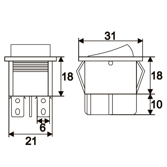 Kapcsoló típusa: DPST Áramerősség: 16 A (20 A) - 250 V AC Beépítési méret: 28 x 22 mm Kapcsoló mérete: 31 x 25,5 mm Csatlakozó mérete: 6 x 10 mm Világítás színe: Piros Kapcsoló színe: Fekete