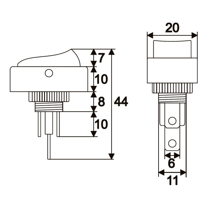Kapcsoló típusa: SPST Áramerősség: 20 A / 12 V DC Beépítési méret: 12,5 mm Max. panelvastagság: 4 mm Csatlakozók mérete: 6.3 mm Led színe: Sárga Kapcsoló színe: Fekete