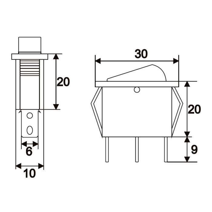 Áramerősség: 16 A (20 A) - 250 V AC Kapcsoló típusa: SPST Beépítési méret: 28 x 10,5 mm Kapcsoló mérete: 31 x 14 mm Csatlakozó mérete: 6 x 9 mm LED színe: Piros Kapcsoló színe: Fekete