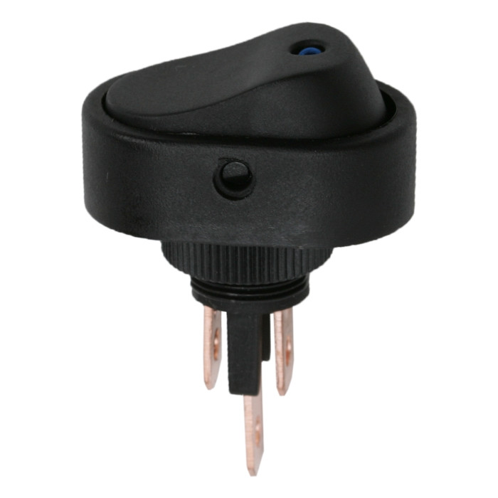 Kapcsoló típusa: SPST Áramerősség: 20 A / 12 V DC Beépítési méret: 12,5 mm Max. panelvastagság: 4 mm Csatlakozók mérete: 6.3 mm Led színe: Kék Kapcsoló színe: Fekete