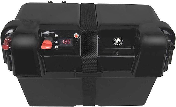 Practical 12V/100Ah battery box with wiring, terminals and 12V+USB sockets. A smaller charger or solar controller can be installed in the lid to further extend the capabilities of the device.