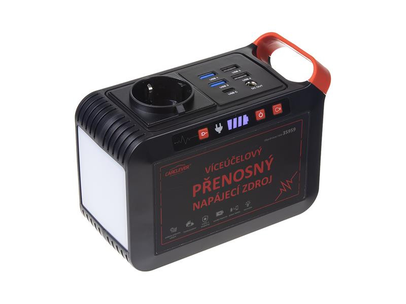 This multifunctional charging station charges various appliances and can be used as a power source for things like a 12 V car vacuum cleaner or fan, or as a power source for camping or camping.