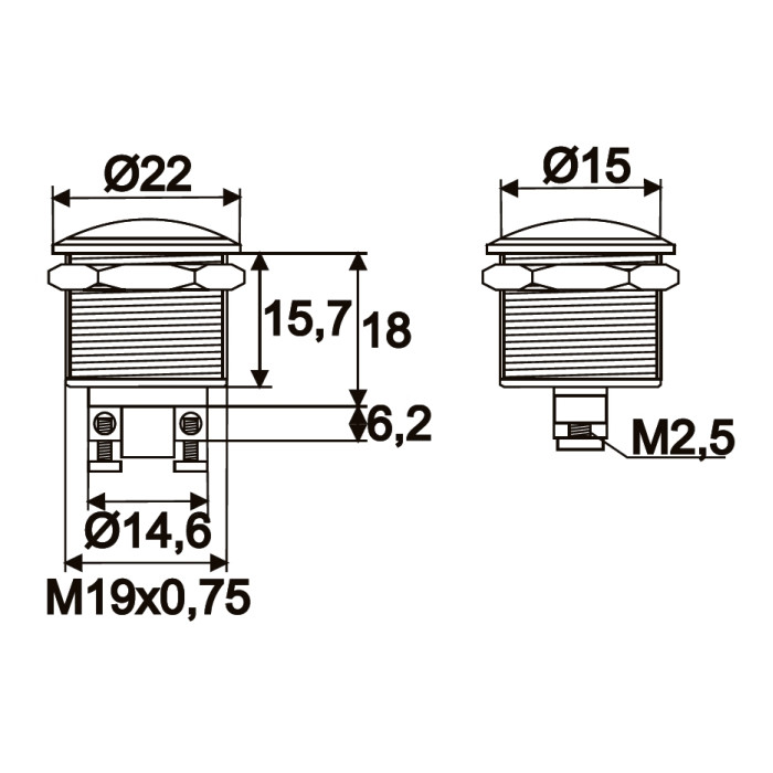 Kapcsoló típusa: SPST Áramerősség: 2 A - 250 V AC Beépítési mélység: 24,2 mm Beépítési méret: M19 x 0,75 Csatlakozó méret: 6,2 mm