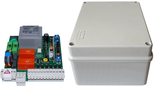 Egymotoros vezérlő toló-, szárnyas- és redőnykapukhoz, 230VAC, 433MHz vevő.