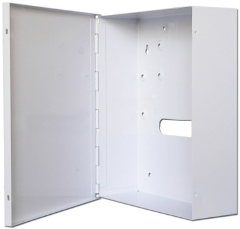 Fémdoboz, zongorapántos ajtó, széles kábelbevezető nyílás, fehér, 435x330x170mm.
