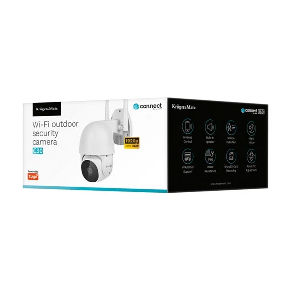 Ügyeljen a biztonságra nemcsak lakásában, hanem az udvarban is. A Kruger&Matz Connect C30 kültéri Wi-Fi kamerával a nap 24 órájában figyelemmel kísérheti a háza előtt zajló eseményeket. Ezt a modern eszközt okostelefonjáról vezérelheti, így bárhol is van, mindig kézben tarthatja a helyzetet. Győződjön meg saját szemével, mennyire praktikus és kényelmes ez a megoldás!Minden időjárási körülményreFigyelmet érdemel a strapabíró tok, amely megfelel az IP66 ellenállási osztálynak. A Connect C30 térfigyelő kamera víz- és porálló. Ráadásul nem félnek sem a melegtől, sem a hidegtől. Az év bármely szakában kézben tarthatja, mi történik az udvarán!Intelligens asszisztensA Kruger&Matz Connect C30 vezeték nélküli kamera tökéletes kiegészítője az okosotthon berendezéseinek. A Wi-Fi kapcsolatnak köszönhetően a készülék a TuyaSmart alkalmazással vezérelhető, így bárhol is van, bármikor ellenőrizheti, mi történik az udvarán. Figyelem a részletekre A Wi-Fi Connect C30 kamera tökéletes eszköz azoknak, akik minden részletet látni szeretnének. Ez a modell 20 képkocka/másodperc sebességű felvételt tesz lehetővé 5 Mpx (2560 x 1920 px) felbontásban, ami nagyon részletgazdag képet garantál.