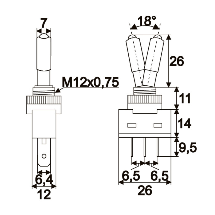 Kapcsoló típusa: SPST Áramerősség: 20 A - 12 V DC Beépítési mélység: 26 mm Kapcsolóház szélesség: 12 mm Kapcsolóház hosszúság: 26 mm Kapcsolókar hosszúság: 26 mm Kapcsolókar átmérő: 7 mm Csatlakozó: 3 db 6,4 mm LED Színe: Zöld