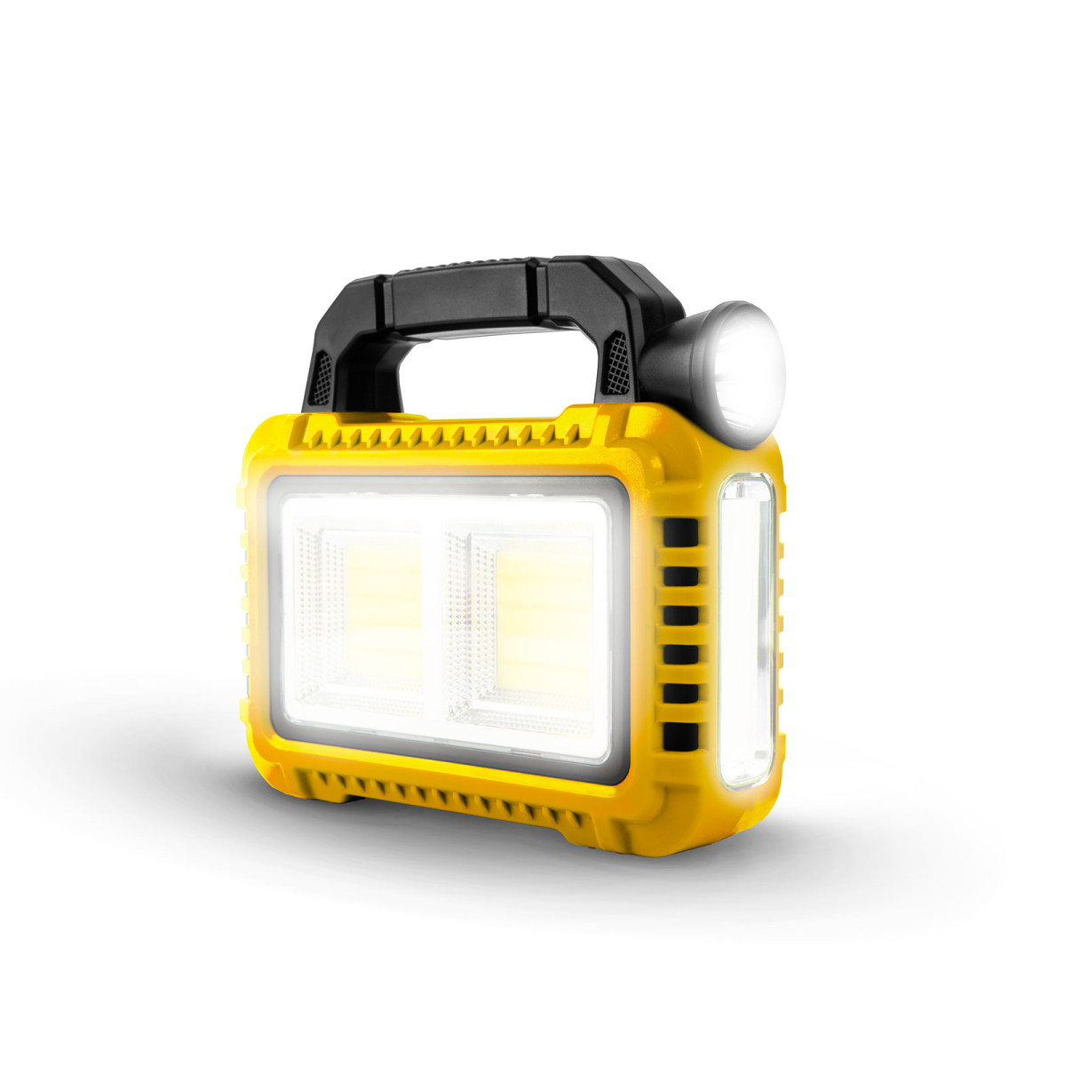 Ez a sokoldalú, multifunkciós kézi lámpa minden körülmények között biztosítja az Önnek szükséges fénymennyiséget. Kiváló választás ház körüli munkák, szabadtéri munkák, barkácsolás, autószerelés, szabadidős tevékenységek, túrák, horgászat vagy akár kempingezés alkalmával. Tartozék a különálló, kábellel csatlakoztatható szolár panel és kettő, szintén kábeles csatlakozással rendelkező LED izzó, amelyek lehetővé teszik, hogy a hatékony energiagyűjtés és a világítás térben elhatárolva történjen. Ideális olyan helyen történő felhasználása, ahol nincs kiépített hálózati világítás, de szükséges a megvilágítás. A lámpa központi része nagy kapacitású, 3600 mAh-s akkumulátort tartalmaz, amelyet szolár panelről vagy USB-C csatlakozón keresztül lehet feltölteni. A feltöltött akkumulátorból, a beépített USB-A csatlakozón keresztül lehetőség van külső eszközök tápellátására is, így powerbank-ként is használható. Az akkumulátor töltöttségi szintjének kijelzéséről visszajelző LED gondoskodik.