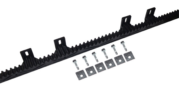 Erős, fémszál erősítésű, műanyag fogasléc tolókapu motorokhoz. A hat felfogató fül biztosítja az