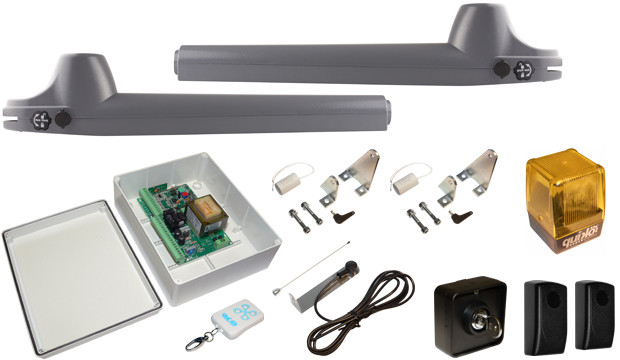 Kiváló minőségű, rendkívül megbízható, tartós működésű kétszárnyú kapunyitó szett. A szett tartalmaz minden olyan egységet, ami a kapu mozgatásához szükséges. A nagyfokú ellenálló képességű, acél és bronz szerkezeti elemekből álló és öntött, porfestett alumínium burkolatú elektromechanikus, orsós tengelyű motor biztosítja a hosszantartó, hangtalan működést. A kulcsos kuplungszerkezet lehetővé teszi, hogy vészhelyzet vagy áramszünet esetén , kézzel tudja működtetni a kapuszárnyakat akár külön-külön is. Egyszerűen és gyorsan üzembe helyezhető. Az elektromos vezérlést egy mikroprocesszoros áramkör biztosítja, mely beépített rádiós vevőegységgel rendelkezik. A mellékelt antenna biztosítja, hogy a távműködtetés nagyobb távolságból is lehetséges. A biztonsági kiegészítők - villogó és fotocella - biztosítják a figyelemfelkeltést és a kapu azonnali megállíthatóságát akadály vagy vészhelyzet esetén.