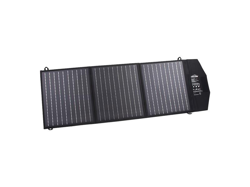 The foldable solar panel is designed for charging 12 V batteries, battery charging stations, laptops, mobile phones, power banks and other devices with a USB connector.