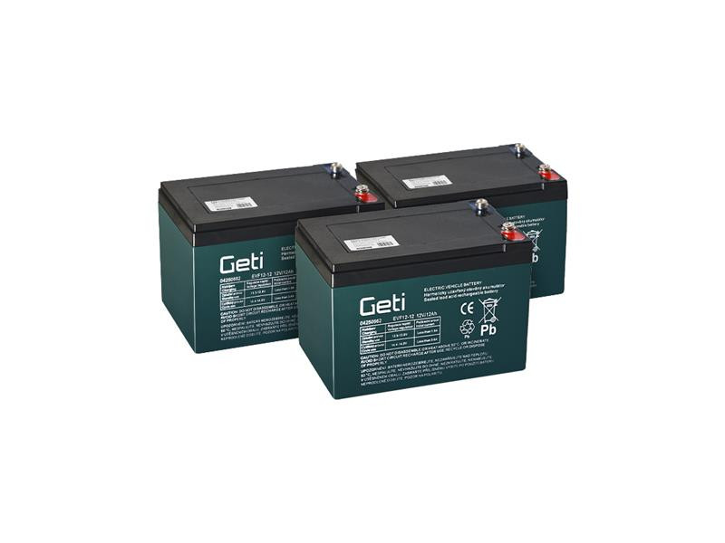 Set of maintenance-free GETI 36V 12Ah (3x12V) batteries designed for electric motor drive.