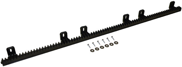 Erős, fémszál erősítésű, műanyag fogasléc tolókapu motorokhoz. A hat felfogató fül biztosítja az erős kapcsolatot a kapuhoz. Gyorsan és egyszerűen felszerelhető a mellékelt önmetsző csavarok segítségével.