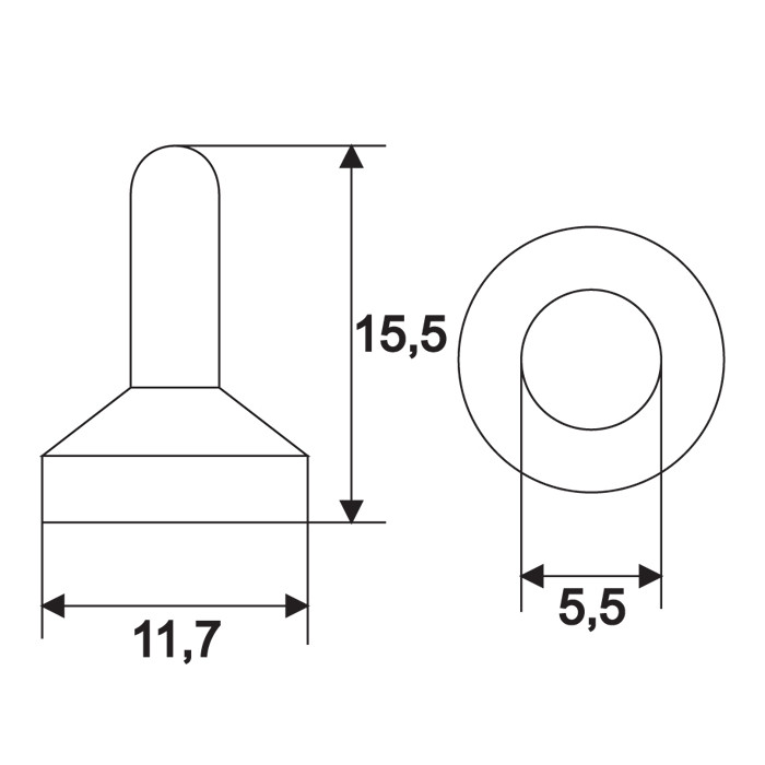 Belső átmérő: 5,5 mm Belső hossz: 15 mm Külső átmérő: 11,7 mm Külső hossz: 15,5 mm Anyaga: Gumi Beépített anya: M6 0,75 mm Szín: Fekete